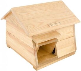 De ingang is uitschuifbaar. Dat zorgt ervoor dat alleen de egel het huisje in kan komen. Naast de ingang zie je een mooi plaatje van een egel. Het huisje is volledig gemaakt van hout.