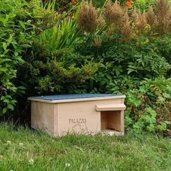 Het hok is gemaakt van dennenhout en heeft een rond dak. Het water kan zo goed worden afgevoerd. Boven de ingang zit een naamplaatje. In het hok kun je wat gras of bladeren leggen, om een comfortabel plekje te creëren.
